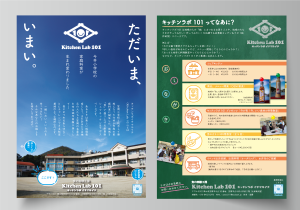 チラシは表面は学校の校舎をメインに、ラボの位置を表示、裏面は黒板をモチーフにデザインしました。